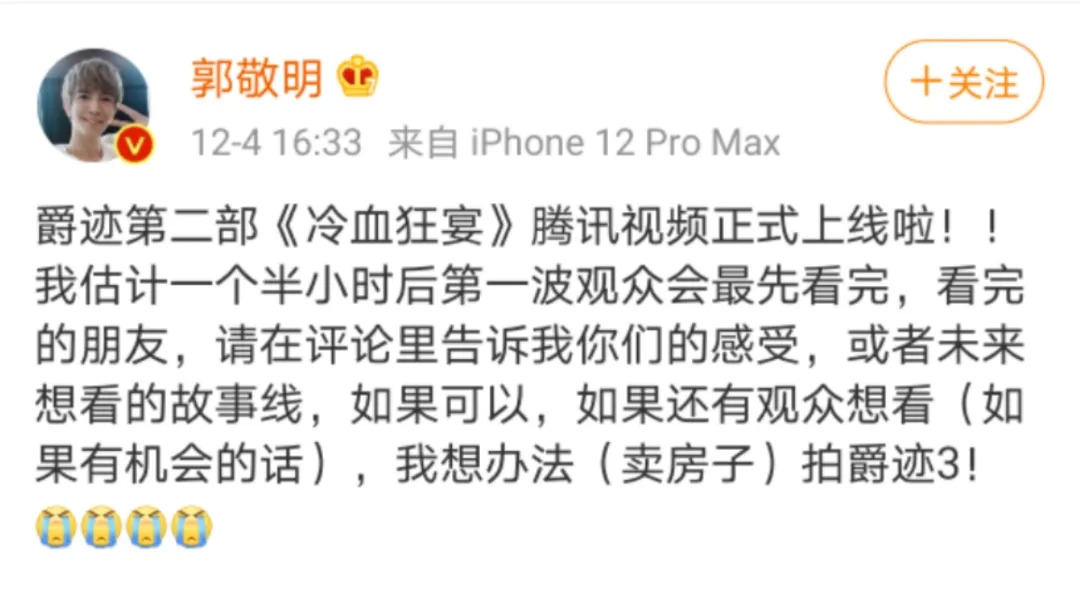 回到《冷血狂宴》,这部电影以超出PVOD电影此前价格一倍的高价上线腾讯视频,算的不仅是经济账,更结合郭敬明作品近期排播策略和相互联动影响、包括为片方及时止损等多方面做了通盘考虑。但即使其对网络电影天花板实现一些突破,基本可以判断该片很难实现盈利。