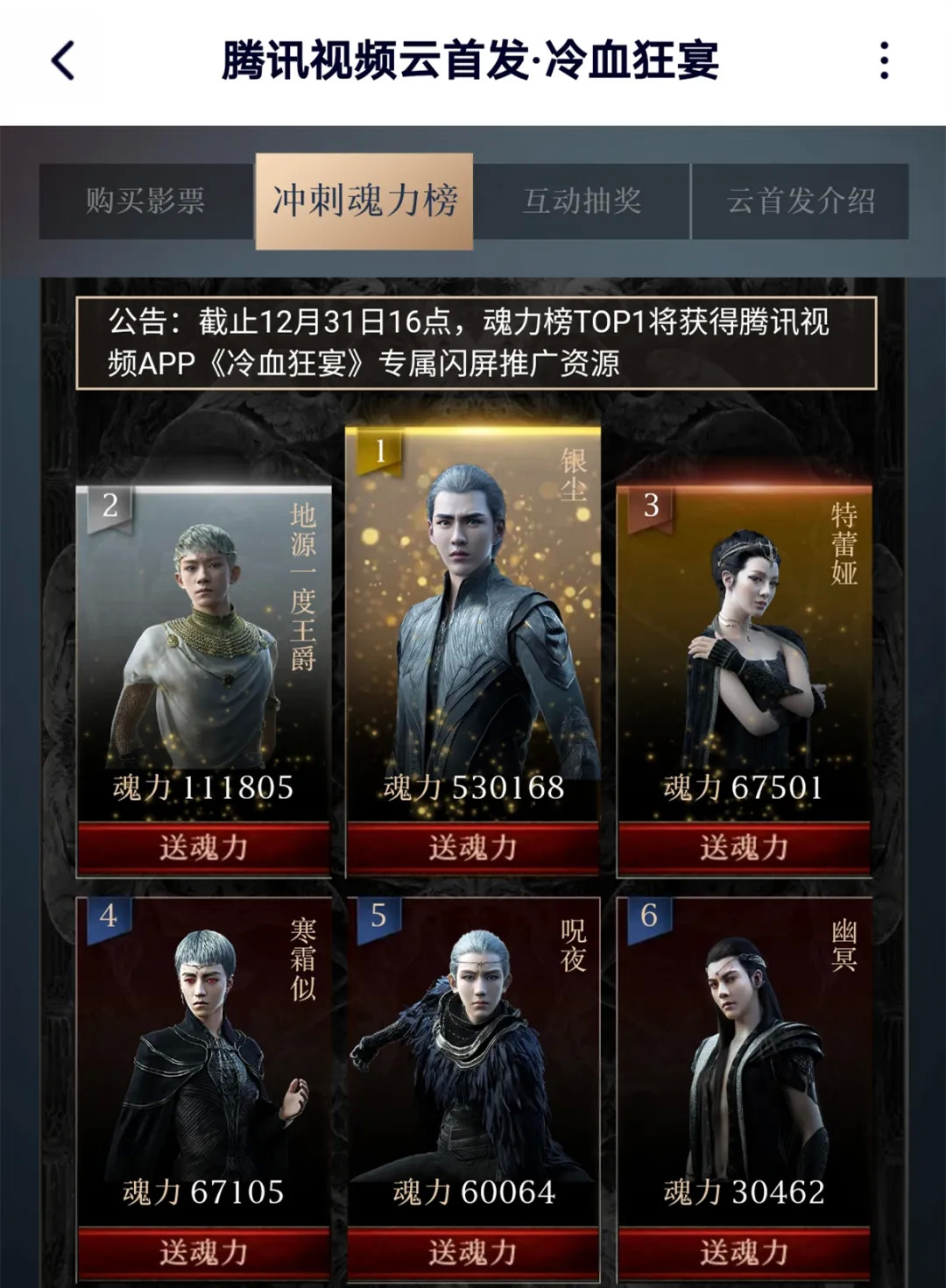 平台还特别为《冷血狂宴》粉丝打榜开放了“魂力榜”活动,规则是各家粉丝通过线上购票和观看花絮预告片方式获得“魂力值”。每张线上观影票可获得20点魂力值且可多次购买(上限200张);而后一种方式要观看30分钟才可获1魂力值,基本可以不纳入考量。