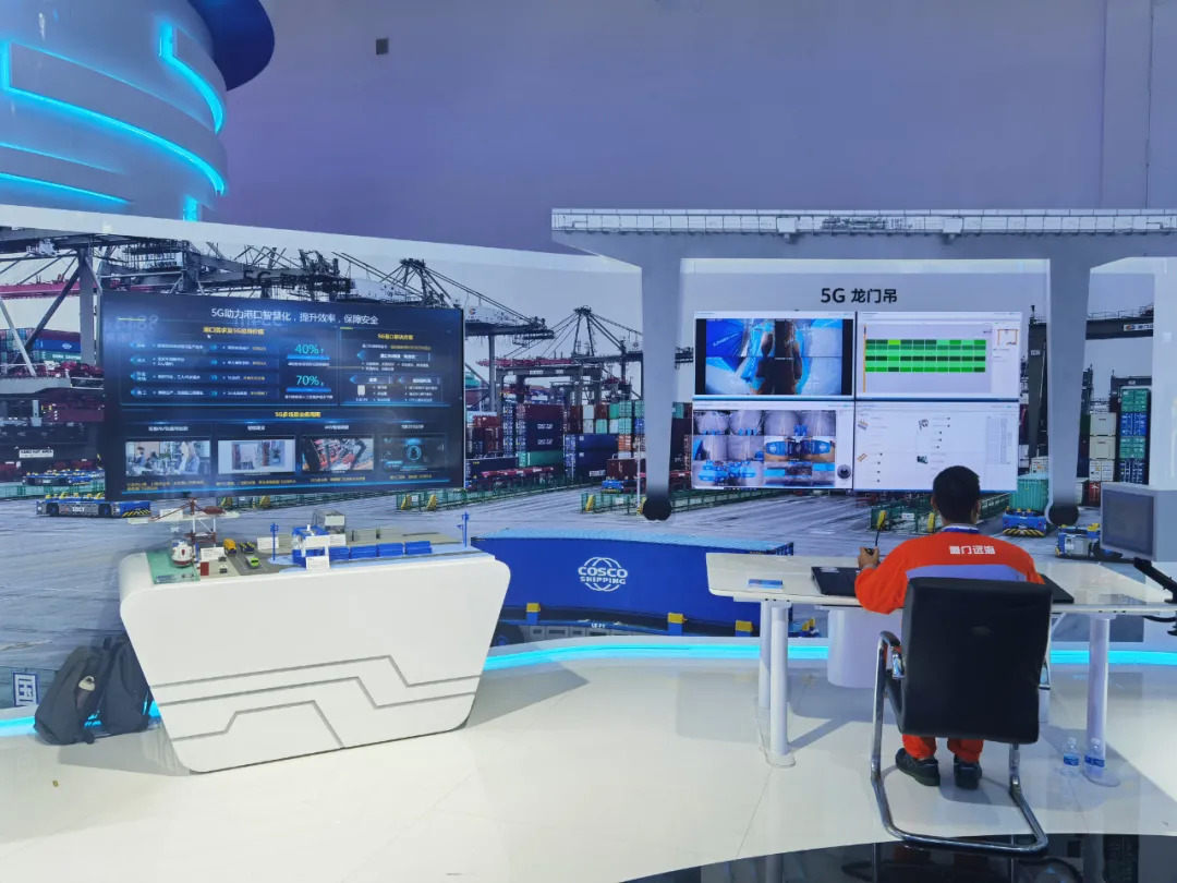 2020年10月在“中国信通展”中远海运港口在北京展会现场搭建操作台,对1700公里以外厦门远海码头的码头港机进行远程操作控制。