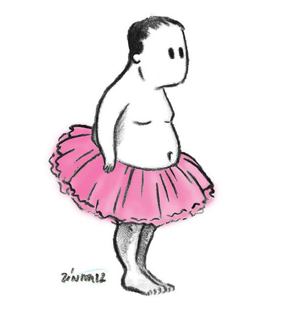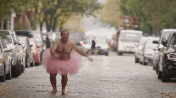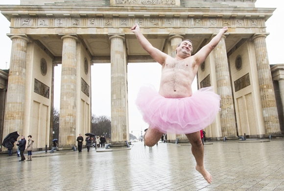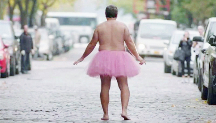 他赤裸上身,露出浓重的胸毛和浑圆的啤酒肚,粉色的芭蕾舞裙在阳光下飘逸跳动。