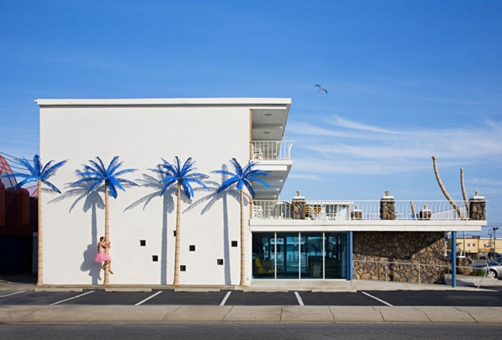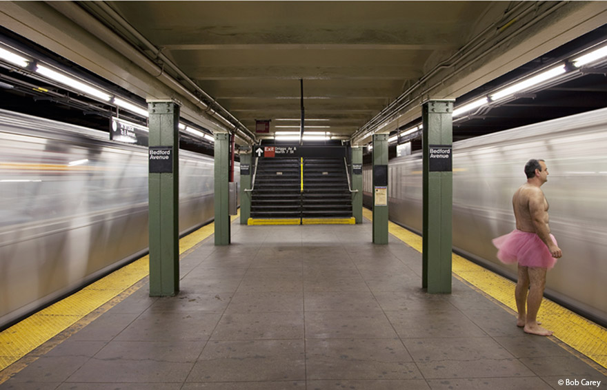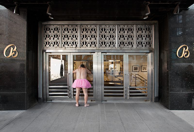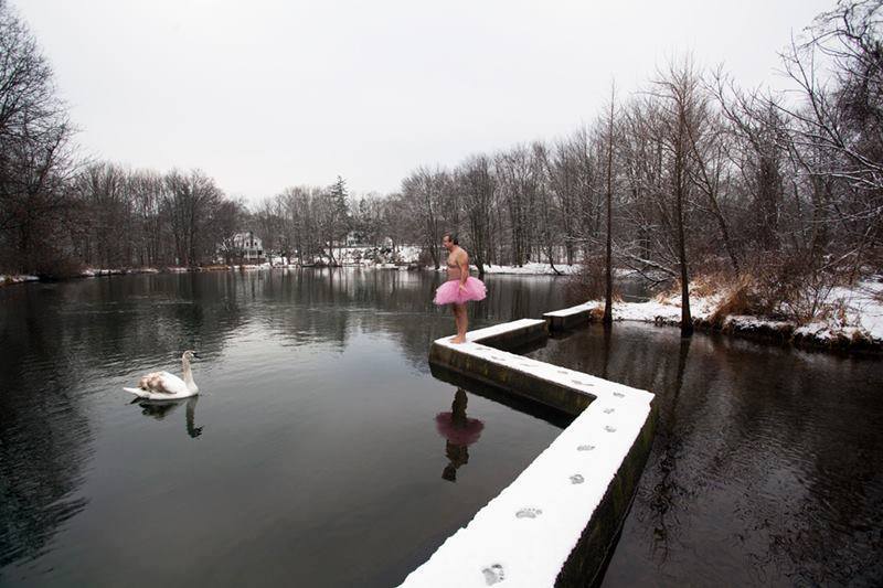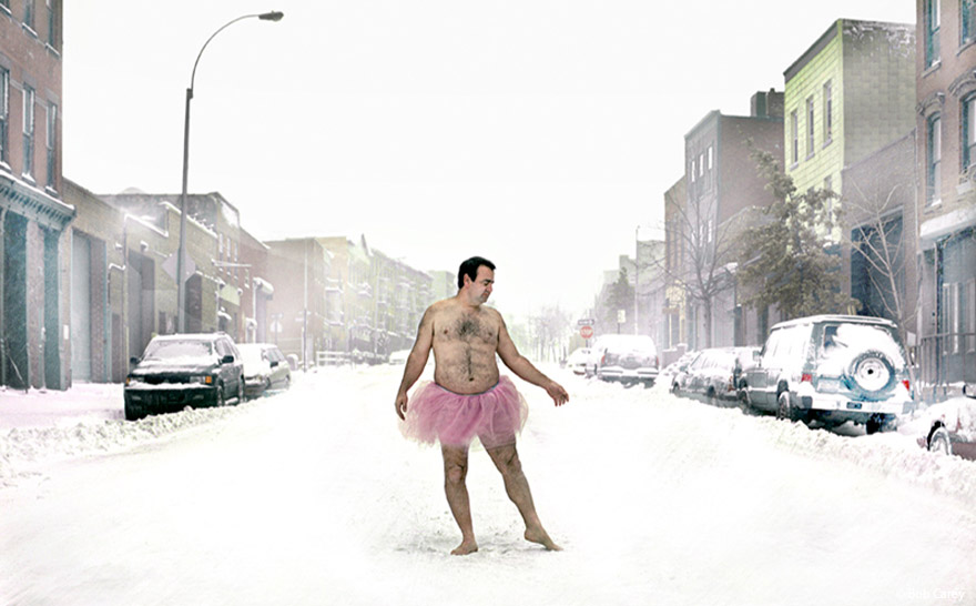 Bob没有让这种郁郁不欢在心里发酵,他拿起相机进入自我治愈模式。出门散心的时候,他突然在汽车后座翻出了一条粉色芭蕾舞裙。那是之前一个摄影项目里的道具。也不知道怎么想的,他换上了芭蕾舞裙,摆着三脚架,拍下了自己笨拙滑稽的身影。