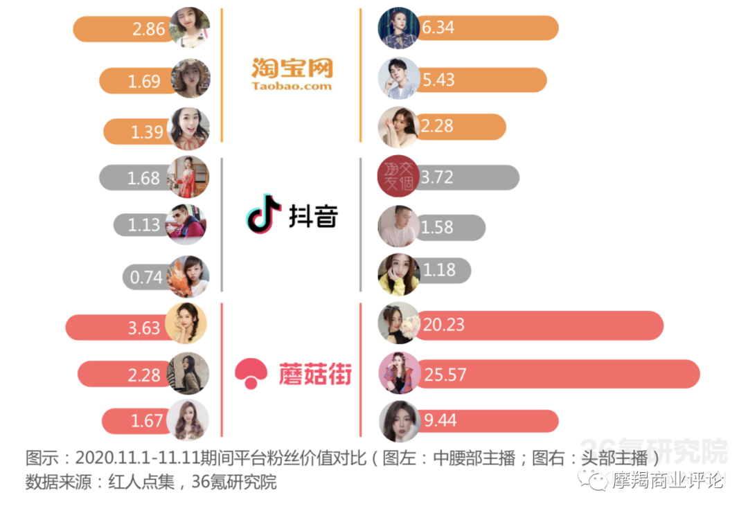36氪研究院近日发布的《2020年中国直播电商行业研究报告》显示,虽然GMV不敌综合类传统电商平台,但蘑菇街的商品与核心客群垂类特征明显,平台粉丝的强购买心智,以及与导购红人之间更近的情感距离,强力驱动其形成了全网最高的粉丝价值。