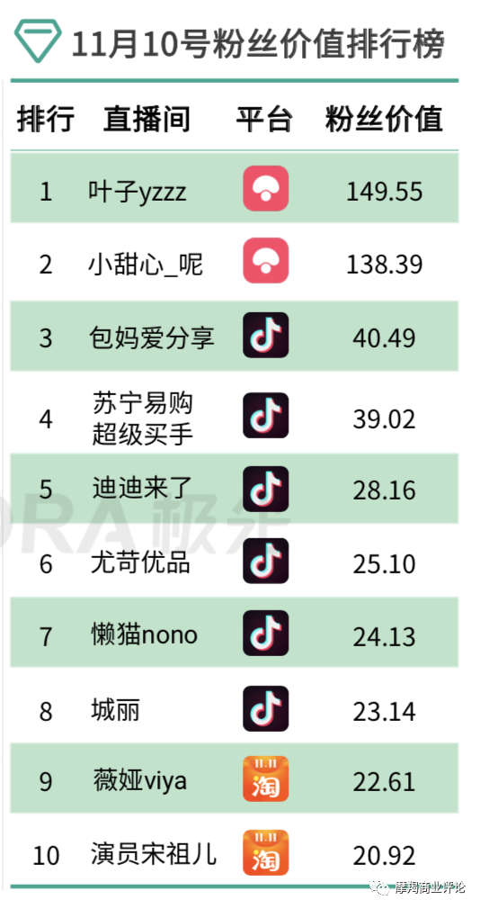 极光大数据的《2020双十一电商行业研究报告》,所得出的市场调研结论与36氪研究院的结论类似。该报告认为,2020双11电商直播的整体转化率为20%,蘑菇街24%的转化率处于行业领先地位。并且,蘑菇街平台主播@小叶子和@小甜心_呢,两者的粉丝价值以明显优势领先于排行榜,而薇娅只能位列排行榜的第9名。