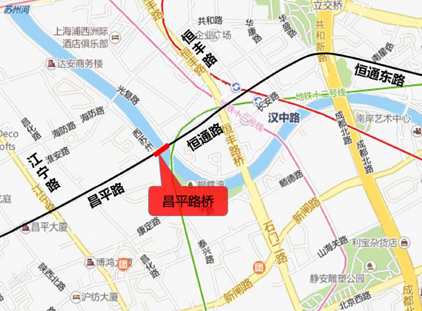昌平路-恒通路跨苏州河桥新建工程,西起昌平路-江宁路路口,沿昌平路规划走向,向东跨苏州河,接恒通路,止于恒丰路,道路总长约853m。
