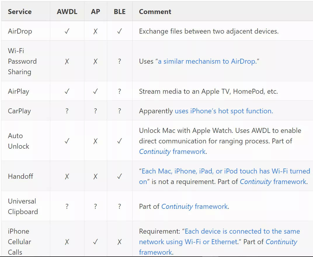 虽然大多数苹果终端用户可能没有意识到该协议的存在,但是 AWDL 是苹果公司 AirPlay 和 AirDrop 等服务的核心,而且苹果公司已经默认在其销售的所有设备上包含了 AWDL,如 Mac、 IPhone、 Ipad、苹果手表、苹果电视和 HomePods。