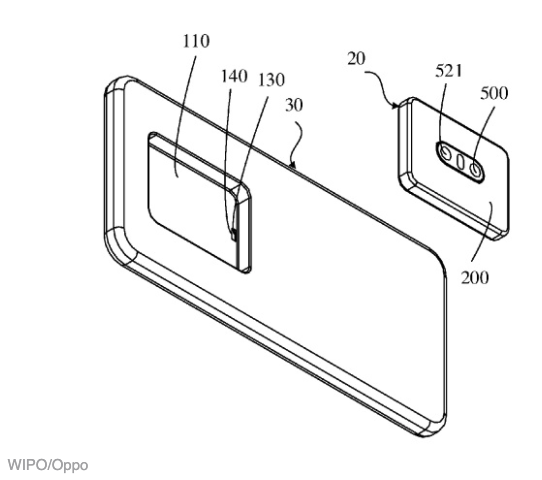 Engadget中国版12月6日消息,91Mobiles在WIPO(世界知识产权组织)网站上发现了一项OPPO申请的专利:在机背可拆卸的部分内装入两颗相机,同时这个分离模组也会自带电池,并支持USB-C、Wi-Fi、蓝牙和NFC。这与vivo此前公布的一套方案类似。