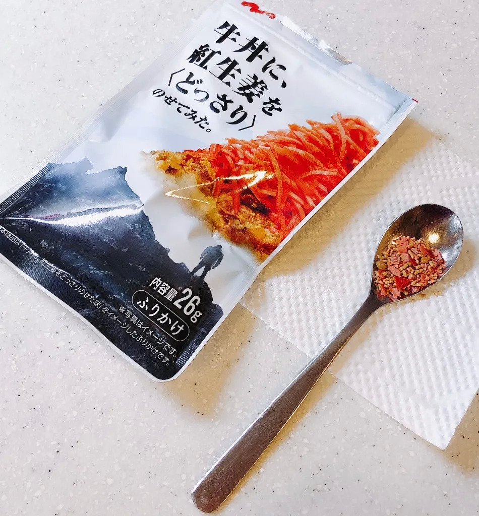 以日式定食屋的基本菜式牛肉饭为灵感,配上调味的红姜风味,即使只有白米饭也能使人食欲大开。产品包装设计尤其让人眼前一亮,通过巧妙的用色和构图,用普通食材营造出电影大片一般的特效场景,带给人们新奇的食用体验,该包装在社交媒体上也成为转发与热议的话题。