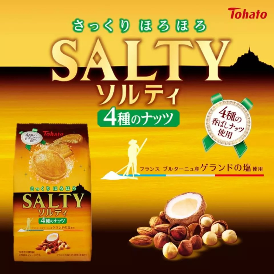 这是Tohato SALTY系列的全新产品。产品以酥脆口感为卖点,使用扁桃仁,椰子,榛子,澳洲坚果四种食材,再加上法国岩盐调味,入口香脆、微咸,是下午茶的不二之选。该产品同时荣获“最佳脆饼”称号。