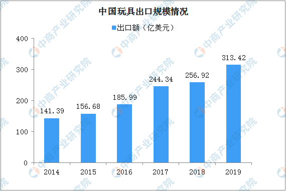 中国作为全球玩具制造大国,制造工艺成熟且精良,2019年玩具出口额可达313.4亿美元。