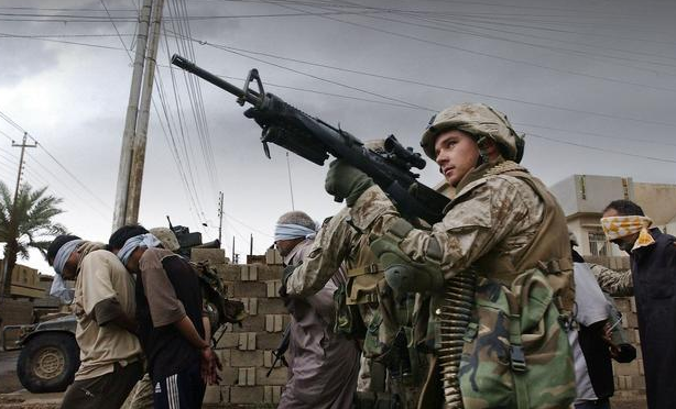△美军把被怀疑是恐怖分子的伊拉克平民蒙着眼睛带走