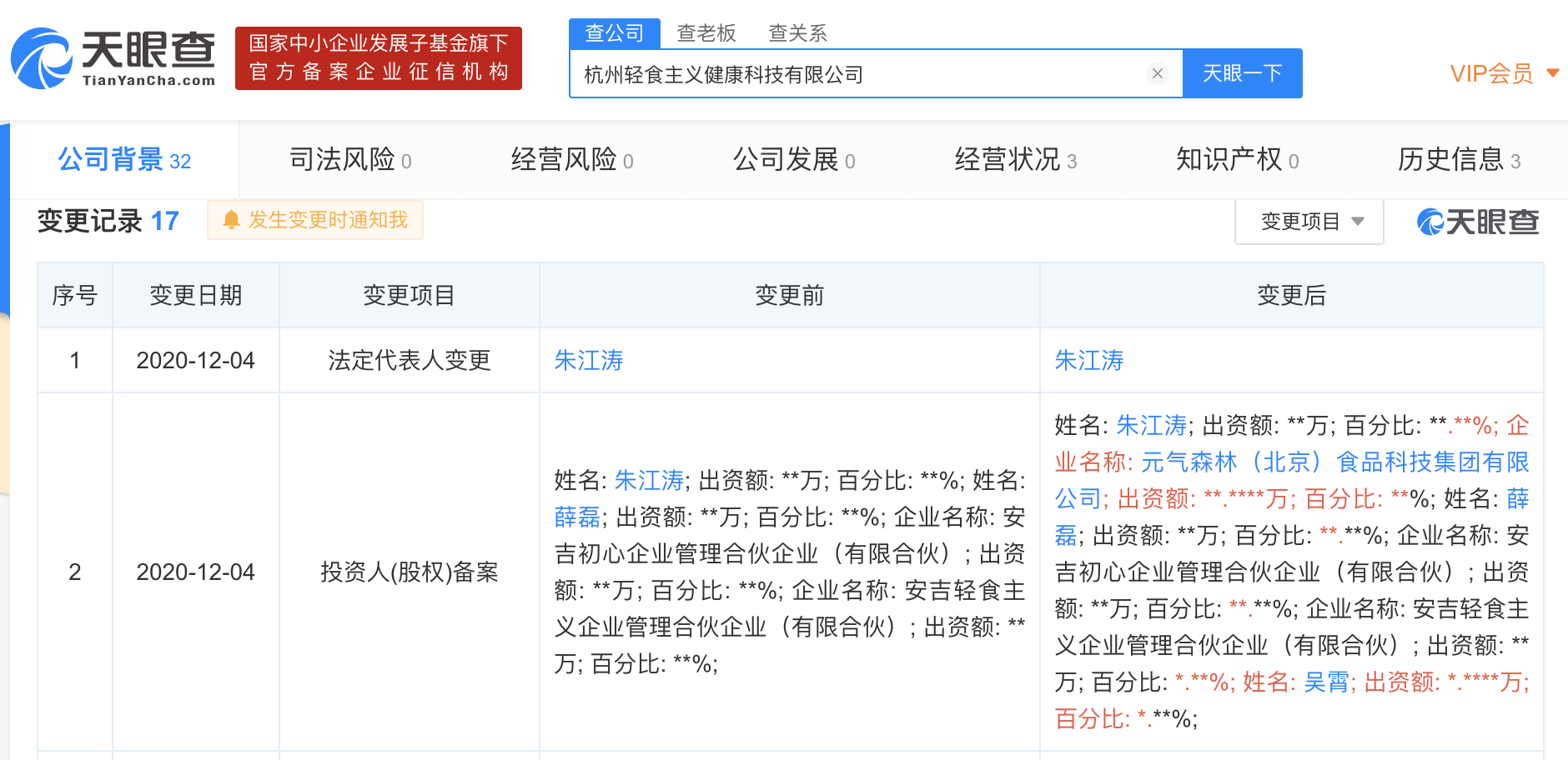 据天眼查APP显示,12月4日,杭州轻食主义健康科技有限公司发生工商变更,股东新增元气森林(北京)食品科技集团有限公司。天眼查App股东信息显示,该公司共有6位股东,其中朱江涛持股比例为38.79%,为第一大股东。元气森林(北京)食品科技集团有限公司持股比例为20%,为第二大股东。
