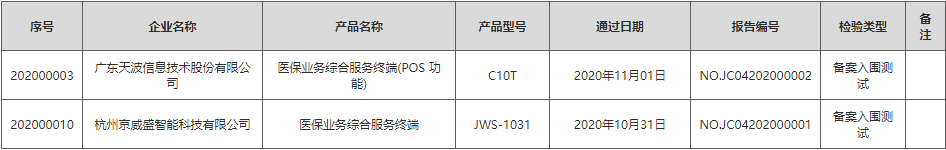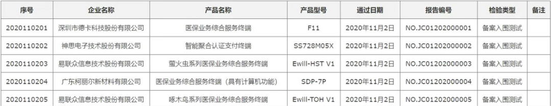 从此次服务来看,由于医保终端的更新换代仍处于起步阶段,第一批过检产品也相对较少,因此参与第一批过检产品检测的机构仅包含其中两家。而从第一批过检的企业来看,其中包含了像德卡、神思、天波这样的专业终端设备制造商,同时也有易联众、柯丽尔(巨鼎医疗)这样专注于医疗领域的系统解决方案商。