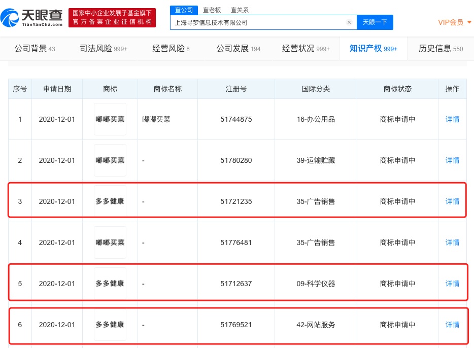 据天眼查APP显示,12月1日,拼多多关联公司上海寻梦信息技术有限公司申请注册“多多健康”商标,申请日期均在2020年12月1日,国际分类涉及科学仪器、广告销售、网站服务,商标状态显示为“商标申请中”。