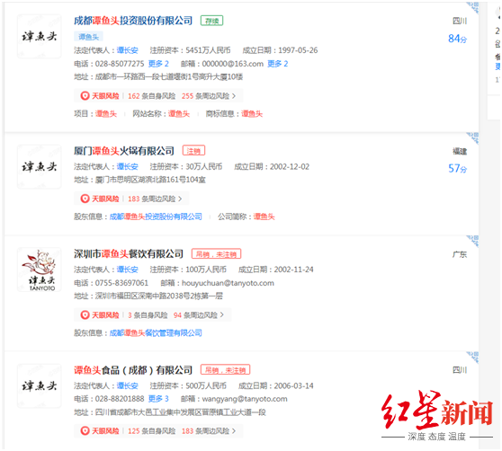 伴随着全国各地店铺的相继关张,那些曾配合经营而设立的谭鱼头地方公司、装饰公司、物流公司等,也都已经注销、吊销和解散。