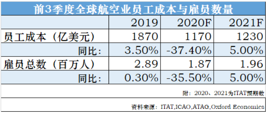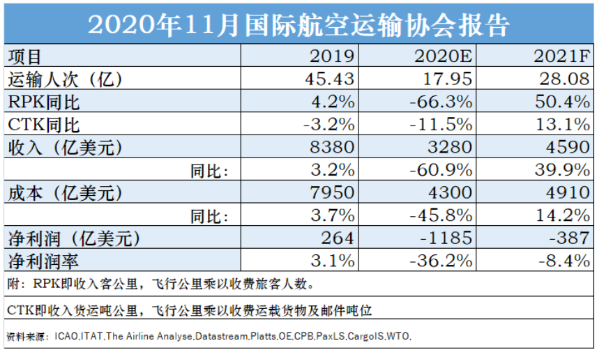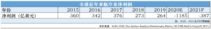 据国际航空运输协会(IATA)截止11月底的预期,2020年运输人次将从2019年45.43亿人次萎缩到17.95亿,全行业航空收入客公里(RPK)预计大幅下滑66.3%;货运受影响较小,但全行业航空收入货运吨公里(CTK)仍预期下滑11.3%。在此基础上,全球航空业收入将下滑6100亿美元,降幅达60.9%;成本虽然也有45.8%的下降,但降幅远低于收入降幅,这使得全球航空业2020年净利润变为-1185亿美元,净利润率变为-36.2%。