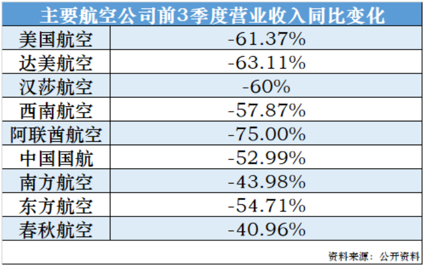 截止三季度,全球主要航空公司的营业收入大幅下滑,其中美国航空公司普遍下滑60%左右;国内航空公司因受疫情影响较小,下滑50%左右。