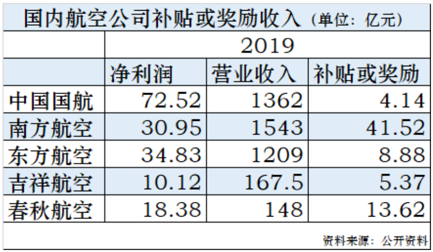 需要注意的是,即使没有疫情,航空业同样是一个高补贴的行业。国外企业就航空业政府补贴问题已经屡起纠纷;在国内,A股上市公司补贴榜长期有航空公司位居前列。数据显示,国内航空公司补贴占净利润的比重是非常高的。