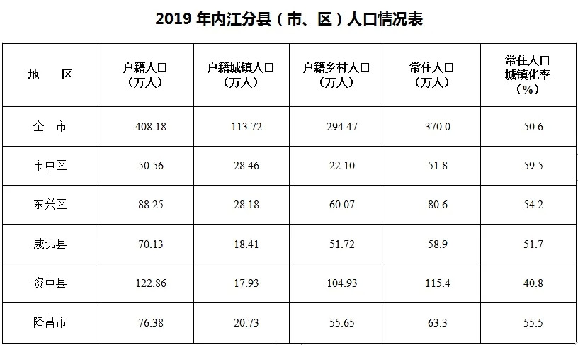 2019年年末,内江户籍总人口408.18万人,比上年末减少3.59万人,其中男性人口210.34万人,减少1.9万人。农业人口294.47万人,减少3.7万人。全年出生人口3.83万人,出生率为9.38‰;死亡人口5.34万人,死亡率为13.08‰。全市常住人口370.0万人。