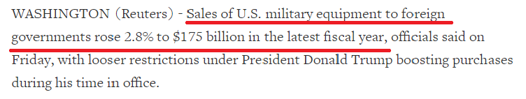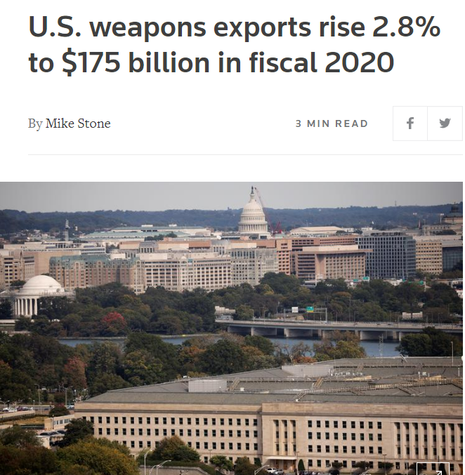 美国国防部和国务院日前双双宣布,在截至今年9月30日的2020财政年度,美国军事装备出口总额超过1750亿美元,同比增长2.8%。战斗机和导弹出口在这一财年显著上升,洛克希德·马丁公司(洛马)等军火巨头均收获了大笔订单。