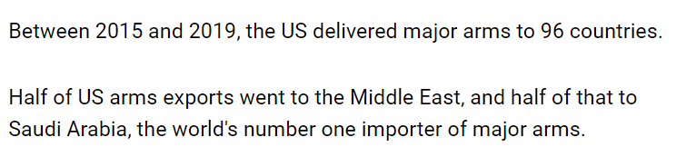 这期间,美国共向96个国家和地区出口了武器,其中53%的武器流向了冲突不断的中东地区。为了配合对伊朗政策的转向,美国总统特朗普2017年上台后首次出访就选择了中东重要盟友沙特阿拉伯,且一举签下了1100亿美元的超级军售大单,导致海湾局势重新陷入紧张。