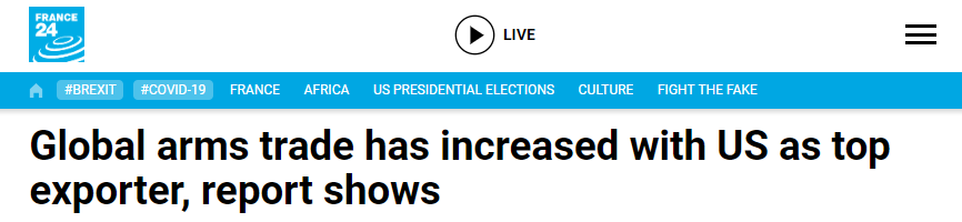国际武器贸易调查机构——斯德哥尔摩国际和平研究所发布的数据显示,美国在2015—2019年间的主要武器出口比2010—2014年大幅增长了23%,在全球武器贸易总额中的占比升至36%,稳坐头号军火卖家交椅。
