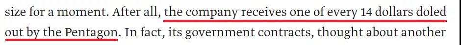 据《独立月报》报道,“洛马”公司为20多个美国政府机构工作,触角遍布国防部、能源部、农业部、中央情报局、联邦调查局、国家安全局、国税局、环境保护局、人口普查局和邮政总局等各个角落。如今,五角大楼每花掉14美元,“洛马”公司就会得到1美元。
