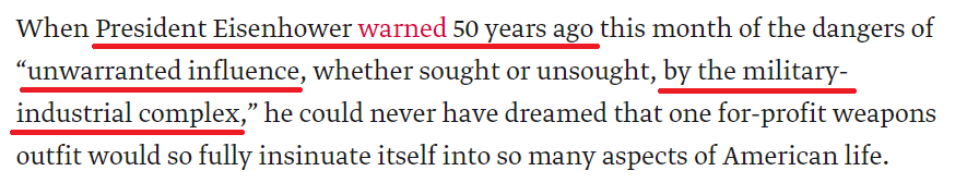 报道还说,美国前总统艾森豪威尔早在半个世纪前就曾警告,“军工复合体”的无限膨胀会让整个美国陷入危机。如今看来,这一警告已成为现实。艾森豪威尔无论如何也不会想到,一个军工企业竟然能够渗透到美国生活的方方面面。