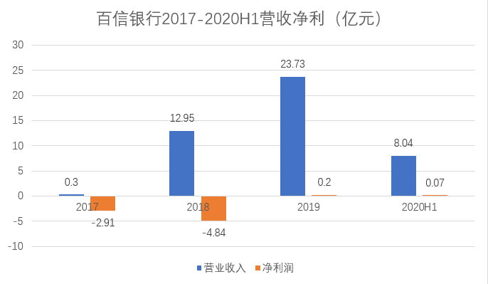 2019年百信银行首次实现盈利,据中信银行2019年年报披露,2019年全年,百信银行实现营收23.73亿元,同比增长83.2%,实现净利润0.2亿元。