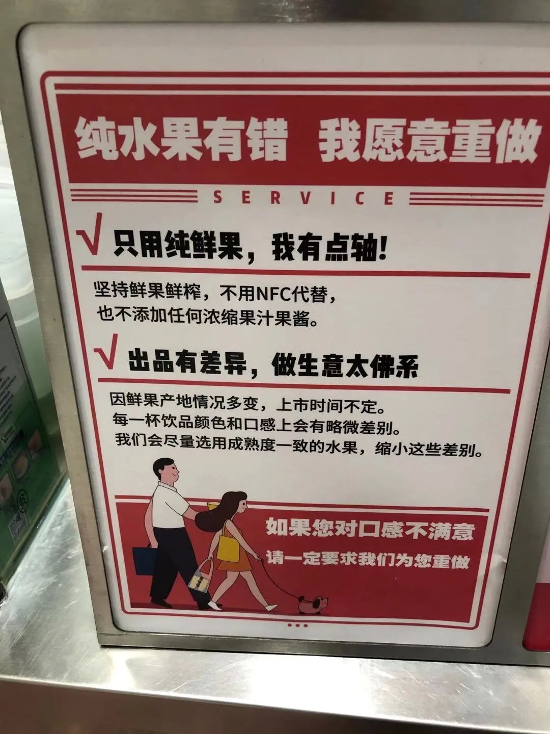 这个操作也是一举三得:既让消费者对口感不稳定的包容性提高了,也强化了门店用鲜果的标签,同时又彰显了不满意就重做的诚意。