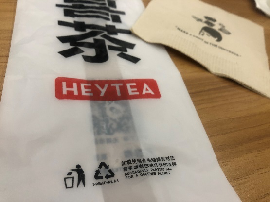我们常常会点的喜茶,外卖打包袋有一句话:此袋使用全生物降解材质,喜茶感谢你对环保的支持。