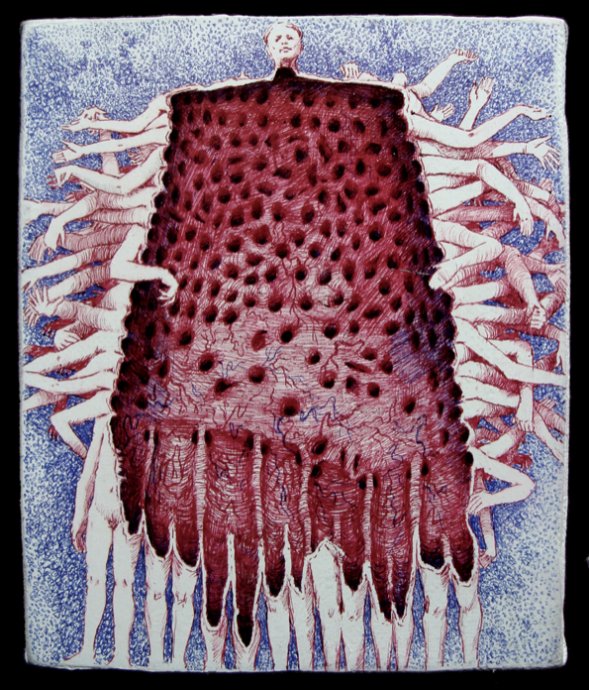 他的画风诡异,带着哥特式的壮观与悲凉。比如“古怪的人”系列: