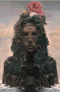 每一个意象都是经过悉心安排的:标志性的脸成了寺庙的主体,眼耳口鼻是一扇扇恰到好处的窗户,头发由飘逸的瀑布或枝桠演绎。那一条挂着的瀑布可能是围巾,也可能是黑色西服里边的浅色衬衫。