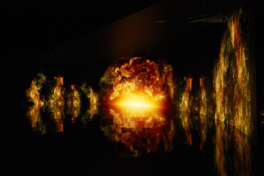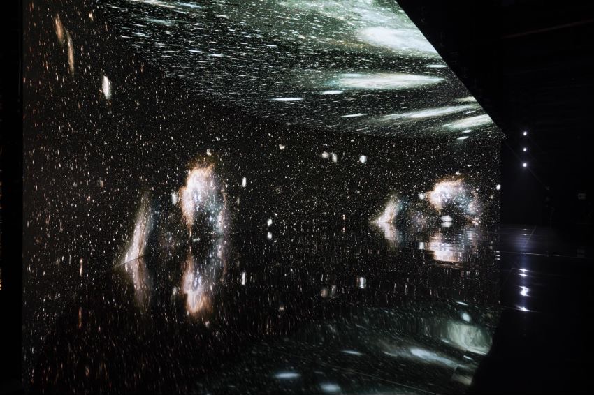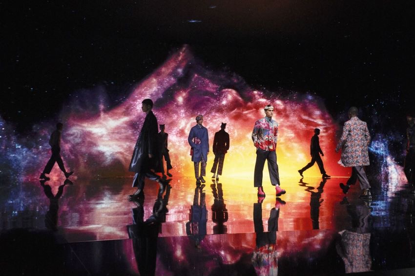 发布的影片现场,迪奥通过球形巨幕的设置,将整个会场转变为“无边际”的舞台。而屏幕上不断变化的星云视频为全场营造出了一种神秘迷幻的氛围。当大秀拉开帷幕,屏幕中穿着最新男装系列的模特依次从星云穿梭至嘉宾“眼前”,一个关于宇宙变迁、时空穿越的故事呼之欲出。