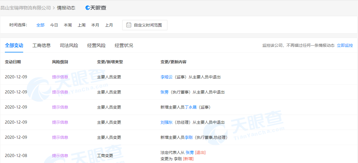 据天眼查APP显示,12月9日,昆山宝瑞得物流有限公司发生工商变更,刘强东(总经理)、张雱(执行董事)、李娅云(监事)从主要人员中退出,新增丁永晟(监事)、李刚(执行董事,总经理)。同时,张雱退出法定代表人,李刚接任。