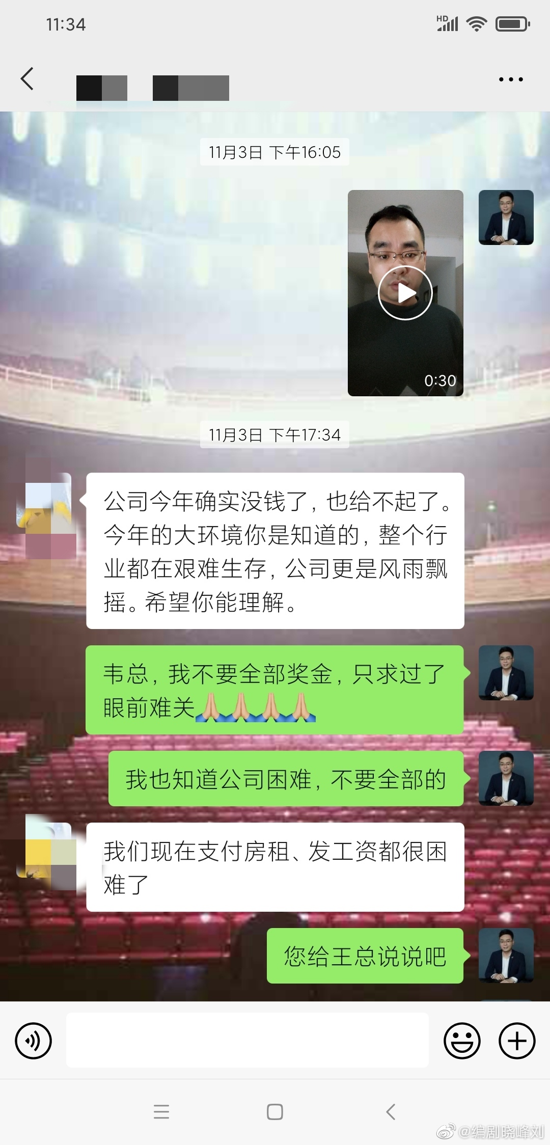 刘晓峰表示,自己因为家庭原因,从今年9月开始急需这比款项,但多次找到香蕉影业讨要也没能成功。在刘晓峰发布的微信聊天记录截图中,可以看到香蕉影业CEO韦翔东表示,“公司今年确实没钱了,也给不起,现在支付房租、发工资都很困难”,以及“王总没有给我这笔钱”。其中的“王总”,指的就是成立香蕉影业的王思聪。
