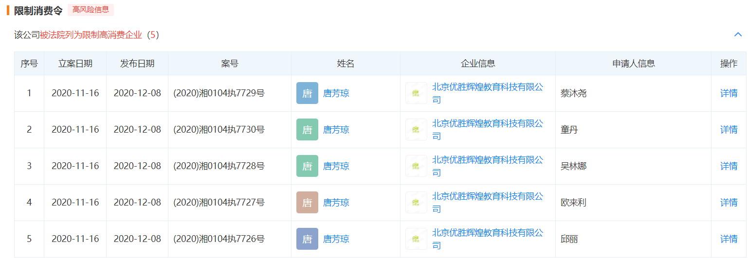 12月9日消息,据天眼查APP显示,北京优胜辉煌教育科技有限公司新增多条限制消费信息,申请人均为个人,限制消费关联对象为该公司法定代表人唐芳琼,发布时间为2020年12月8日。