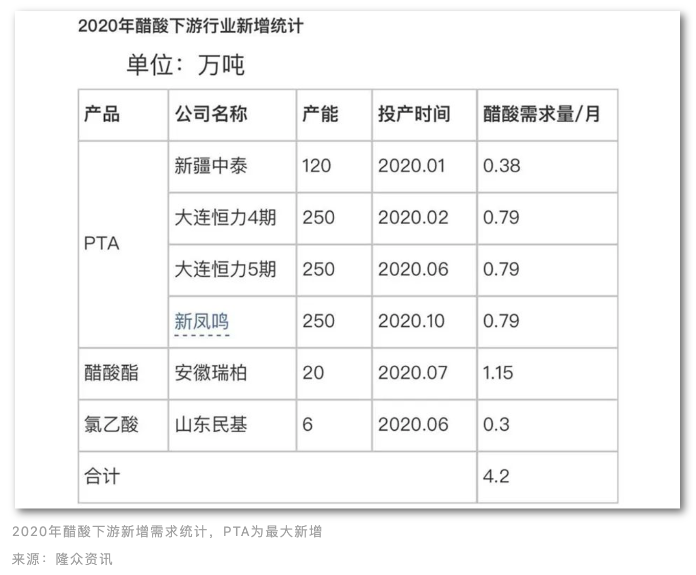 醋酸大涨,还要从今年醋酸下游新增需求来看。从醋酸的需求结构看,醋酸酯类约占总需求的 29%,PTA 行业约占 29%,醋酸乙烯约占 18%, 氯乙酸和甘氨酸行业约占 7%。