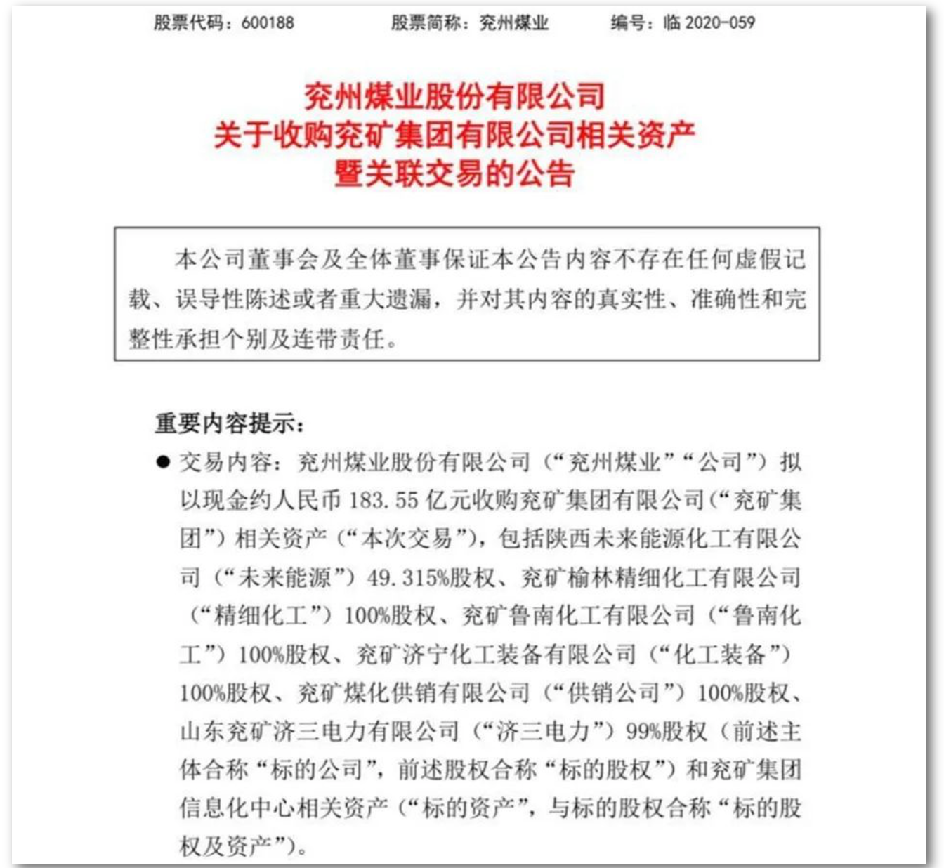 兖州煤业日前发布了拟以现金约183.55亿元收购控股股东兖矿集团的7项相关资产的公告。其中兖矿鲁南化工有限公司(简称“鲁南化工”)是交易标的的主要资产之一。公司收购鲁南化工旨在延伸产业链,实现业务协同发展。
