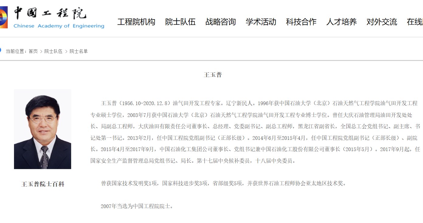 中国工程院官网显示,油气田开发工程专家,应急管理部部长、党委副书记王玉普于2020年12月8日逝世,享年64岁。