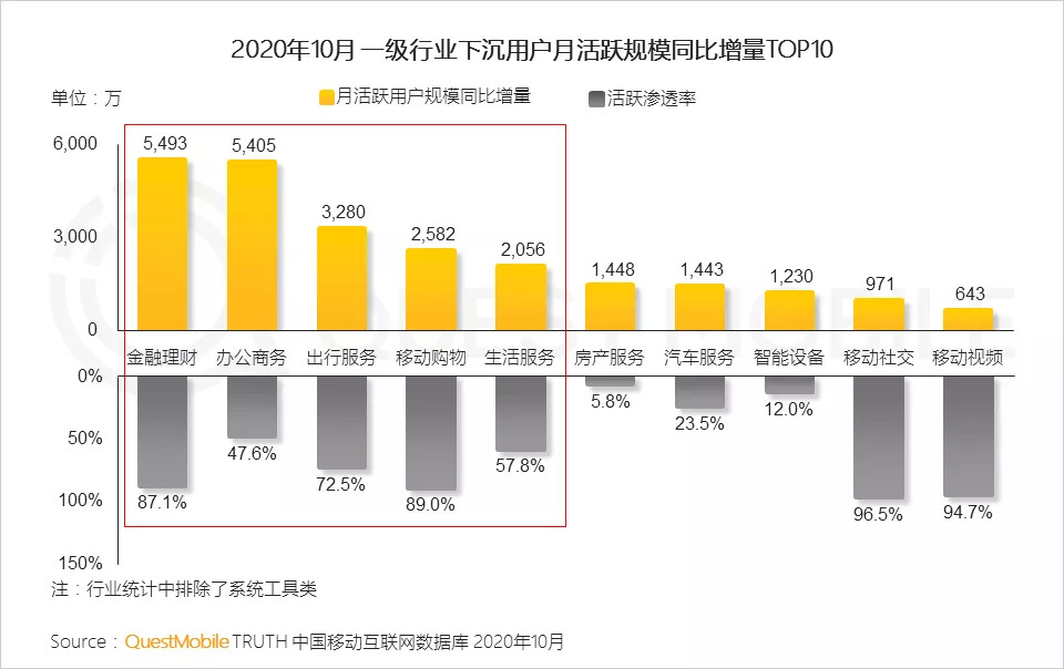1、下沉用户的移动网络生活开始全面化深入,金融、办公、出行、购物、生活服务等覆盖生活各方面的行业用户规模都呈现大幅增长