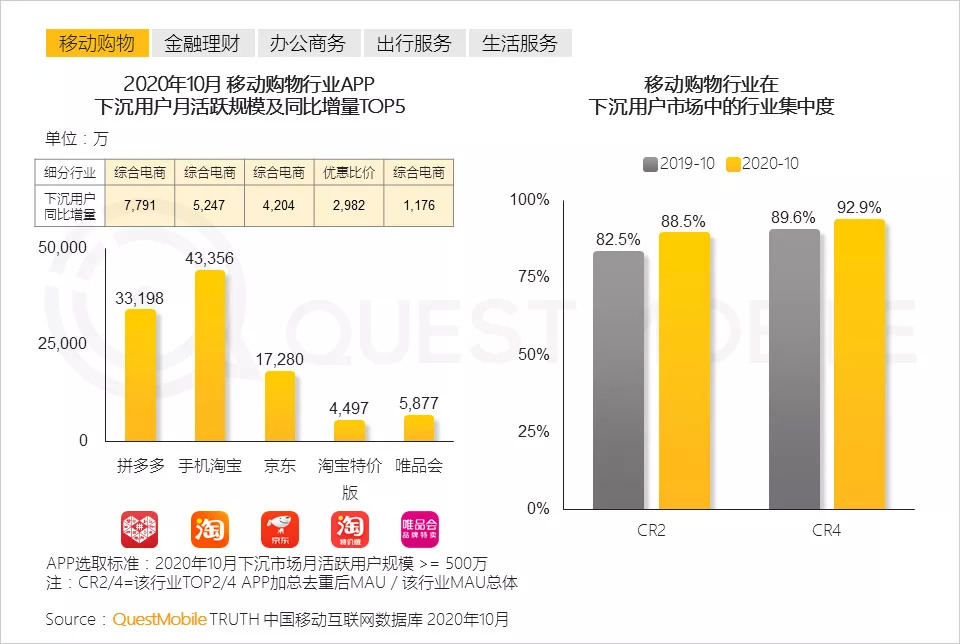 3、头部移动电商平台牢牢占据着下沉市场,整体用户规模在稳步渗透中