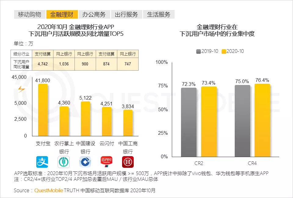 4、随着下沉用户线上购物比例的不断增长,线上支付需求也在稳步增长,由支付宝以及国有商业银行建立起的行业体系已经稳稳占据下沉市场