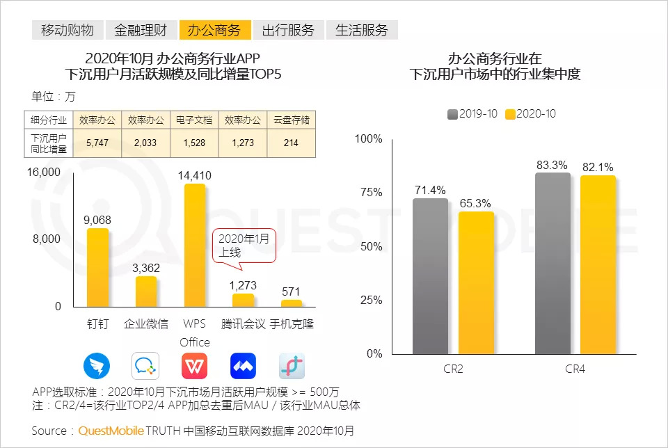 6、疫情带动阿里和腾讯的在线办公应用在下沉市场的快速成长,多应用的快速发展促使办公商务行业面临更激烈的竞争
