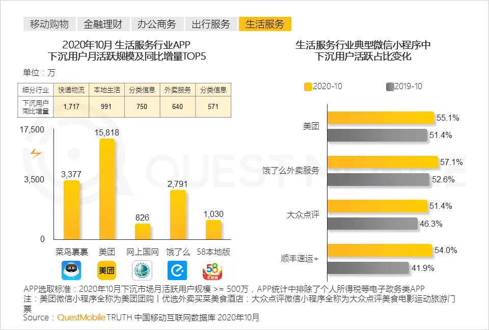 8、下沉用户对于各类生活服务应用的使用也在逐步加深,多种类应用平台稳步增长,其中微信小程序是获取下沉用户的重要渠道
