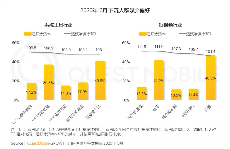 1)系统预装型软件更易触达下沉用户;2)短视频类媒介在用户活跃渗透率上优于长视频。