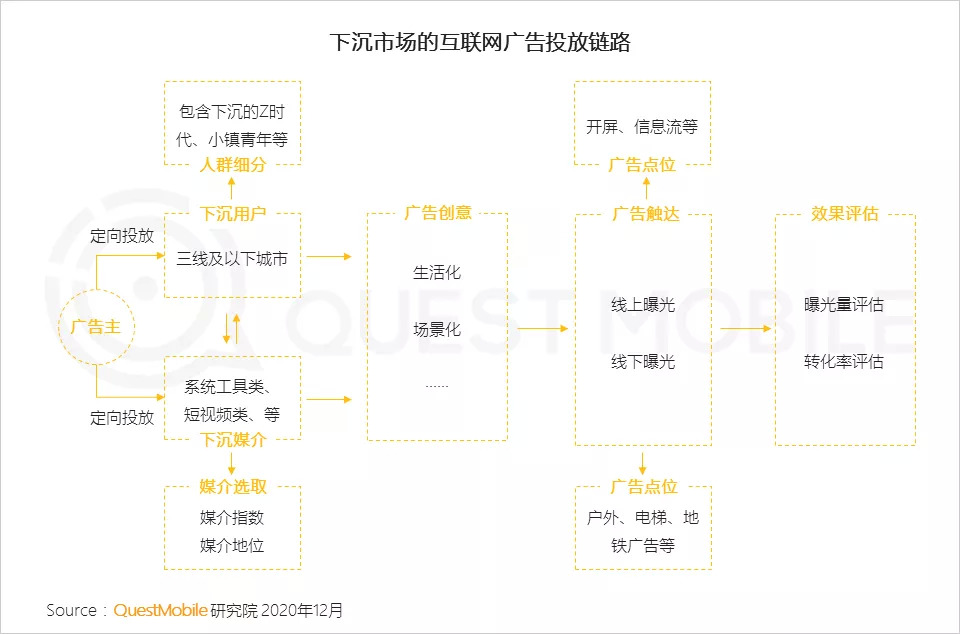 1)圈定目标下沉人群(及细分人群),通过广告内容与点位触达相应人群;2)定向投放下沉活跃媒介,通过媒介传播触达更大范围人群。