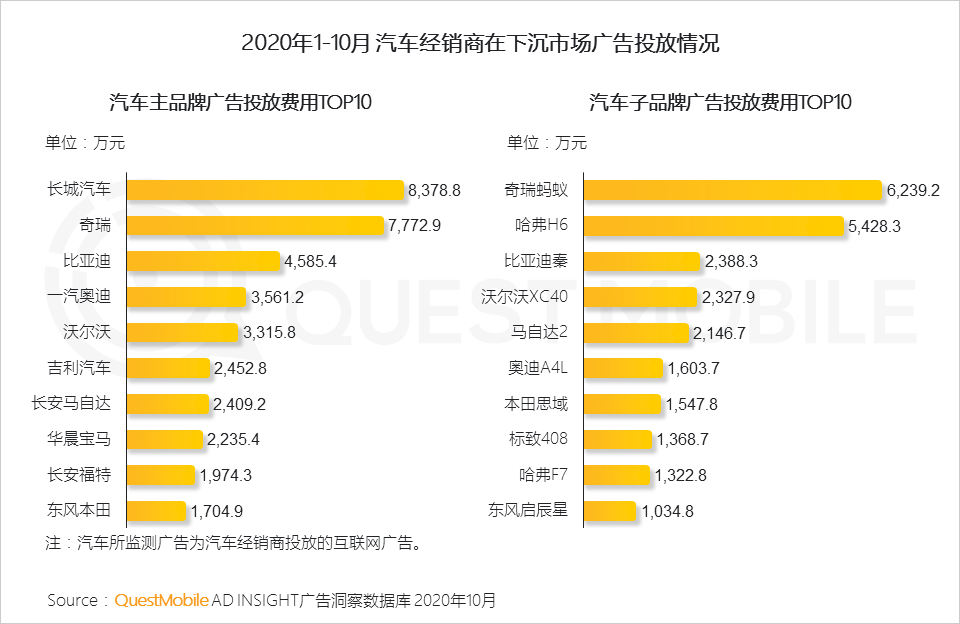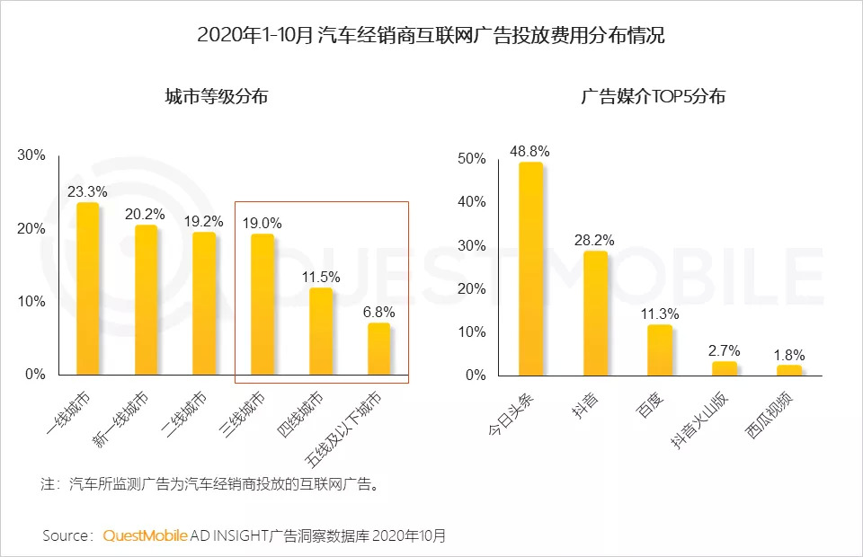 根据品牌主投放目标及投放预算,进行整体预算分配,重点倾向下沉高触达型媒介投放。与更下沉的城市对比,汽车经销商将三线城市作为下沉市场的重点投放目标,媒介选择也更倾向高渗透高流量型媒介。
