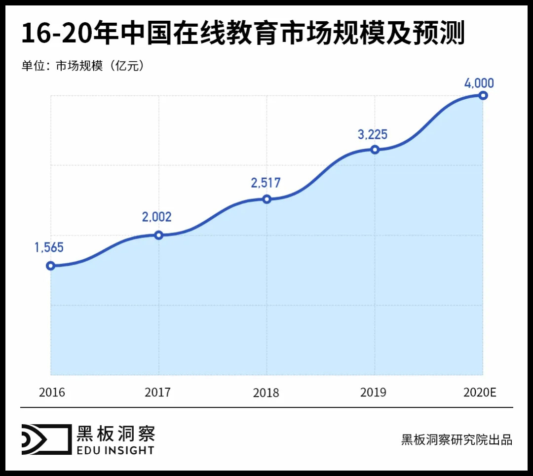 近些年来,在线教育市场规模涨幅明显。据艾瑞咨询数据显示,2016年在线教育市场规模达到1565亿元,2017年在线教育市场规模达到2002亿元,2018年在线教育市场规模将达到2517亿元,2019年在线教育市场规模已经达到3225亿元。即将过去的2020年,在线教育的市场规模更是突破4000亿元。由此可见,我国在线教育市场潜能巨大。
