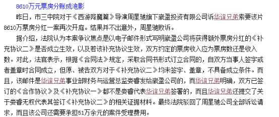 众所周知,分红问题是导致周星驰与华谊兄弟分道扬镳的直接原因。比高集团旗下的崴盈投资有限公司(下称“崴盈投资”)甚至将华谊兄弟告上法庭。当时崴盈投资表示,周星驰曾与王中军口头商定,若《西游降魔篇》票房收入超5亿元,华谊兄弟可给予原告票房分红,双方通过邮件就此达成《补充协议二》。