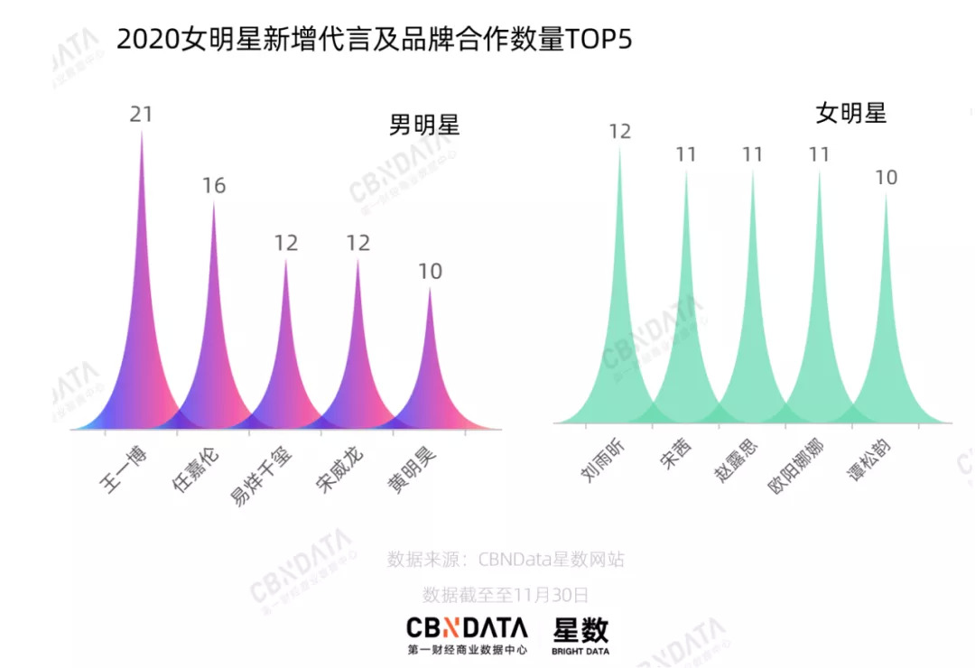 从今年新增代言及品牌合作明星TOP5来看,2020年度,男女明星新增品牌数量第一分属王一博和刘雨昕,前者合作达25个,后者作为今年6月刚刚出道的选秀偶像,也有12个新商务。此外,明显带有偶像标签的易烊千玺、黄明昊、宋茜等人也是流量群体中的佼佼者。